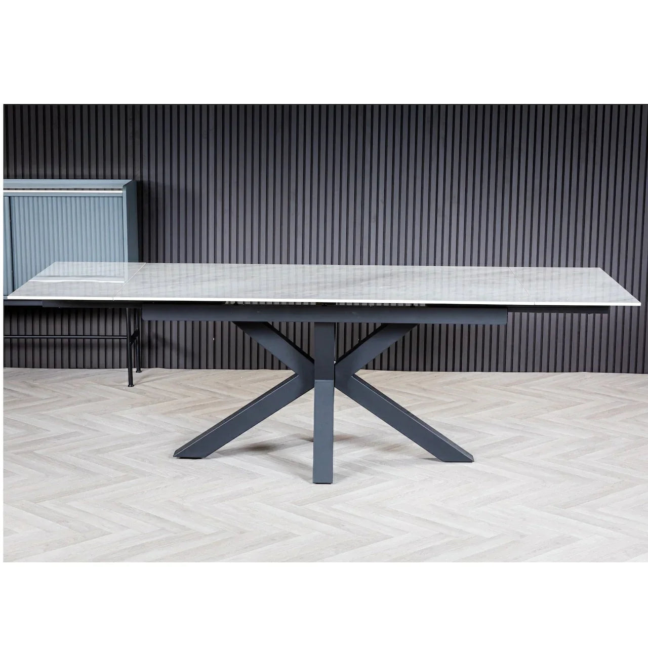 Featuring a remarkable starburst base crafted from black, powder-coated metal and a 12mm thick ceramic top surface with the elegant allure of Carrara marble, this table effortlessly showcases a striking fusion of colours and materials. Its contemporary aesthetics create an ambience that elevates any meal into a special occasion.