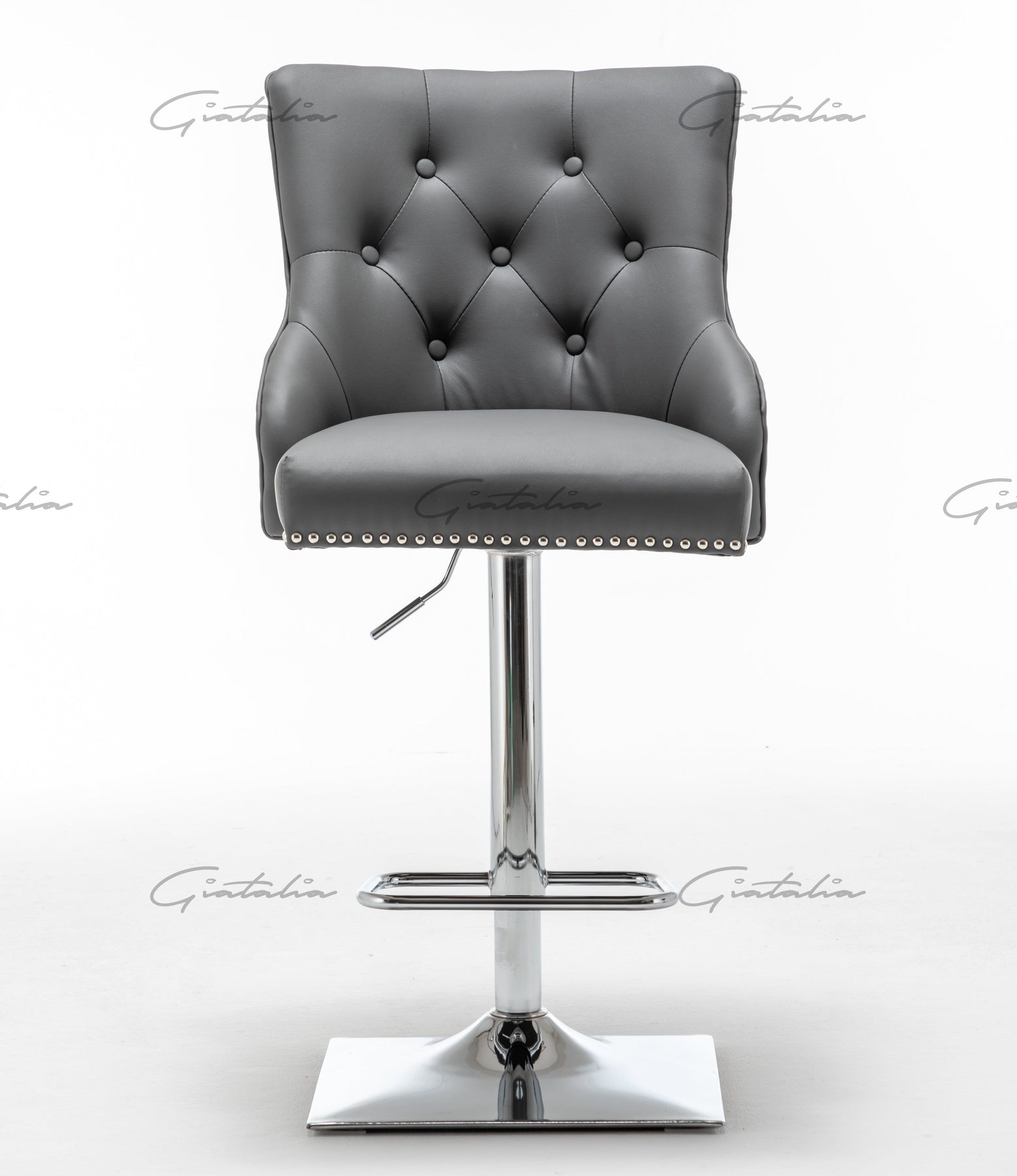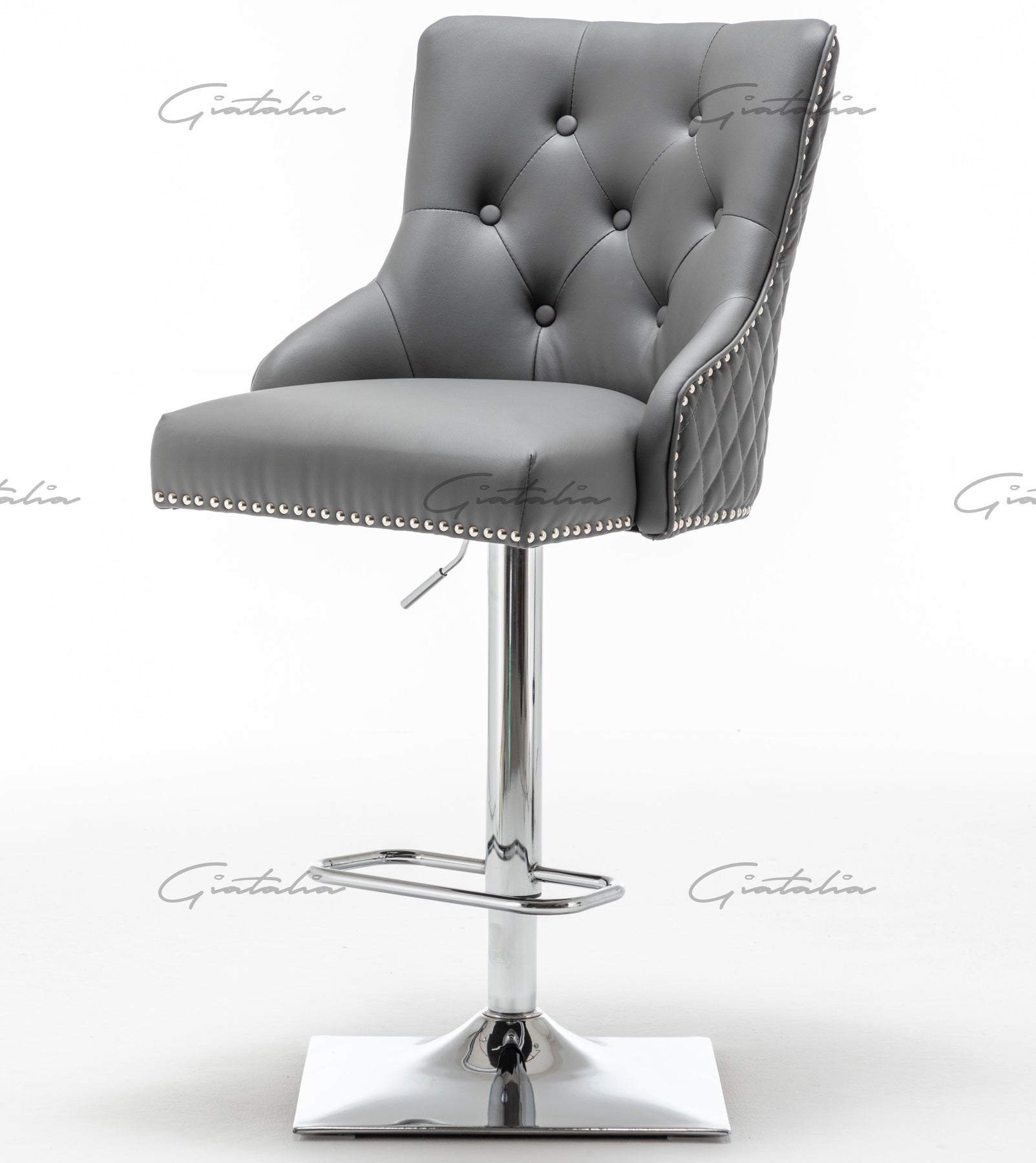 This luxury grey faux leather barstool features a round head knocker and a tufted back design. It boasts a mirrored, quality chrome finish, a moulded back for added support, an ergonomically designed deep foam seat cushion, and rubber feet floor protection. Measurements are H103-113cm : W50cm :  D59cm, with a seat height of 67-77cm and a seat width of 53cm and a seat depth of 60cm. Assembly required. Matching dining chair avaible.