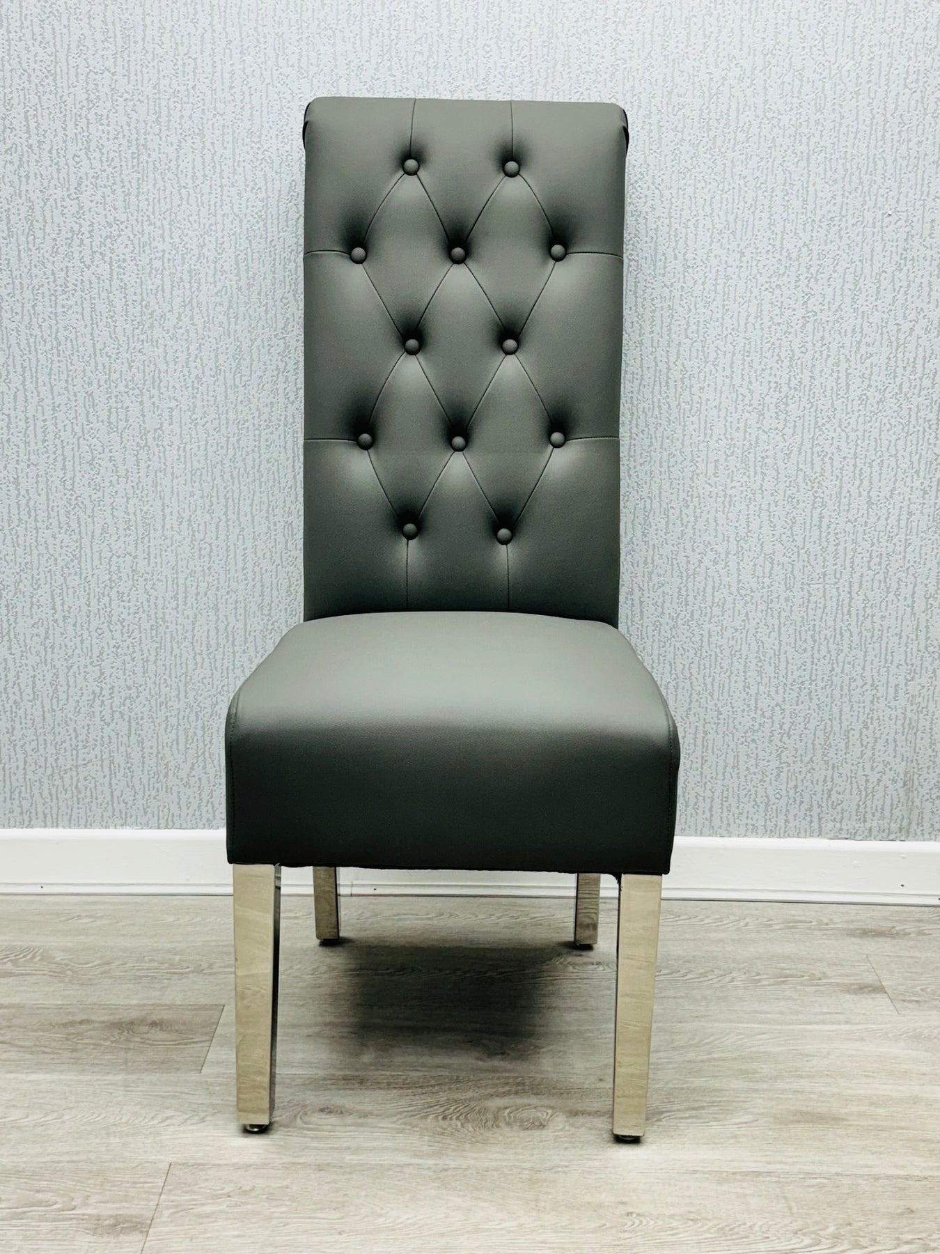 The Lucy Dining Chair is not just a piece of furniture; it's a statement of refined taste and timeless elegance. Crafted with precision and attention to detail by showcasing a gracefully tall scroll top with meticulous buttoned detailing. Adding a touch of opulence, a stunning chrome lion knocker graces the quilted stitched back.